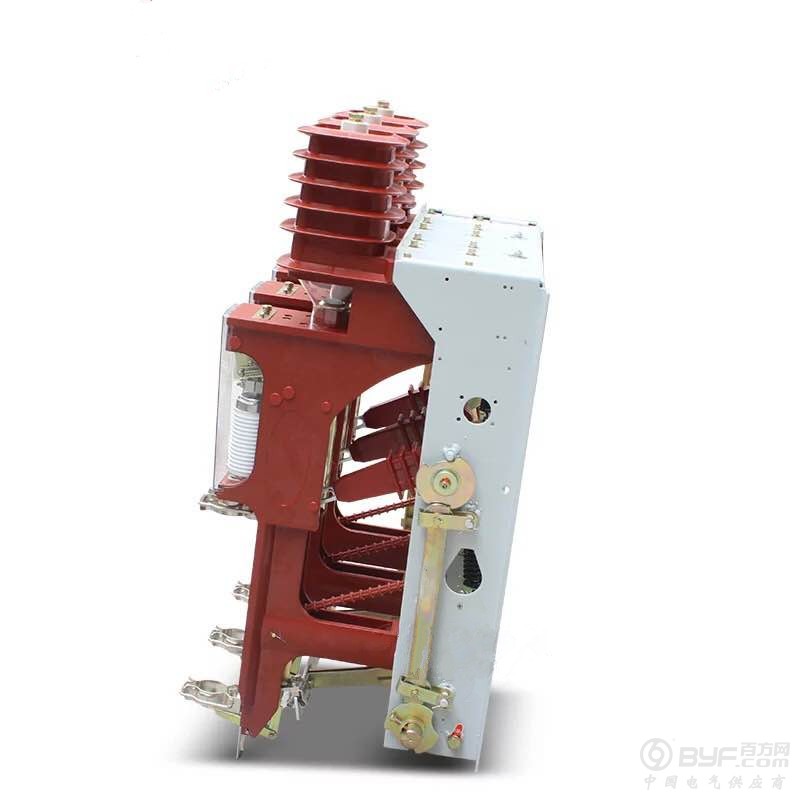 4.1基本结构:FZN25A-12负荷开关采用整体框架组装式结构,每相回路中动静触头封闭在真空管内形成真空灭弧室,它和相关导电体安装在整体绝缘支座上;真空灭弧室上端通过导电体与位于后部的上下直动隔离开关连接成导电回路;隔离开关动静触头及导电体同样安装在上下一体化率时闭绝缘支座中,整个有机整体的绝缘支座被紧固在金属框架上,弹簧储能操动机构有效结合全国同行同类产品的特点,装置于金属框架的侧面,大大提高弹操机构操作使用寿命。若在真空灭弧室下端导电体安装上可拆卸熔断器装置和熔断器及其脱扣装置,构成负荷开关一一熔断器组合电器。在金属框架上装有接地刀臂和弹簧操作机构和联锁;在隔离开关动静触头之间装有耐高温、阻燃、透明的有机玻璃罩,有效保障人身安全;在负荷开关底部装上接地静触头,构成带接地开关的负荷开关和带接地开关的组合电器。