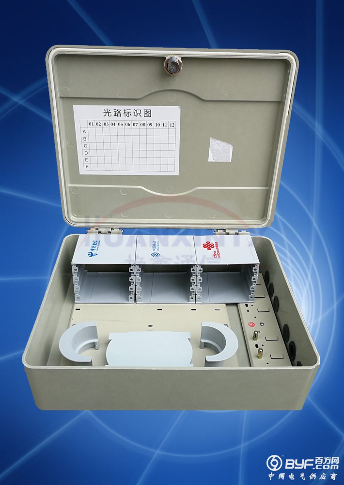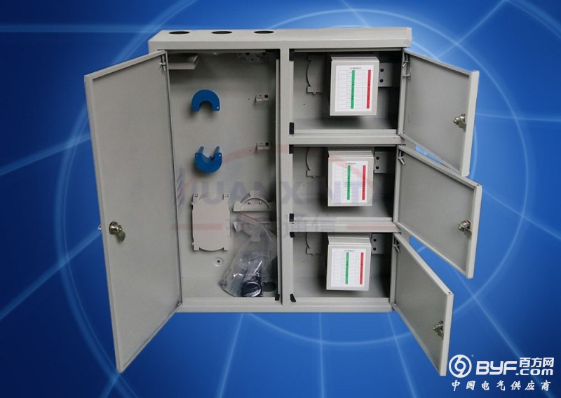 光纤配线架(三运营商共用-室内楼道箱)由箱体、内部结构件、光纤熔接盘片、 光分插片及附件组成。