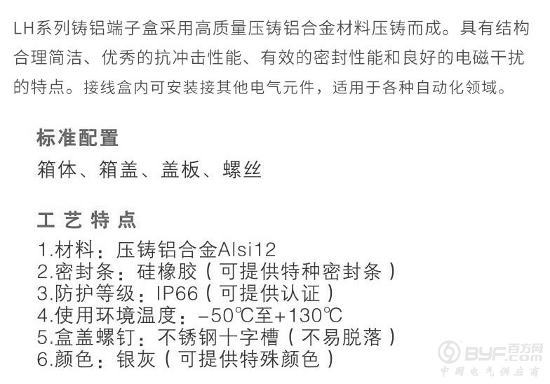 公司主要生产销售:IP44、IP67工业插头插座、IP67防水接线盒、铸铝接线盒、接线端子盒、按钮盒、配电箱、仿威图机柜、不锈钢机柜 、IP68电缆防水接头、按钮开关等众多工控配套产品,组合插座箱,照明配电箱、检修电源箱、动力配电柜、控制柜、冷藏箱插座、低压成套开关柜等产品。产品材质可分为工程塑料、SMC、冷轧钢板、不锈钢等,防护等级达到IP66。产品广泛适用于各种用电场所,已在钢铁、化工、电力、电子、港口、机场、矿山、水泥、石油勘探、、地铁、铝厂以及汽车制造等各类工矿企业得到成功应用。