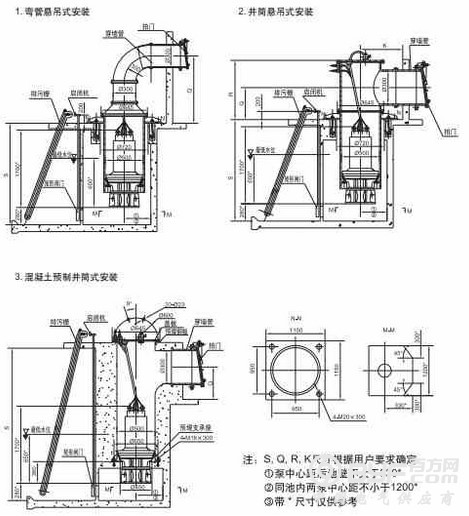 斜拉安装:可潜式轴流泵支撑井筒。适用于游泳池、河流等场所。