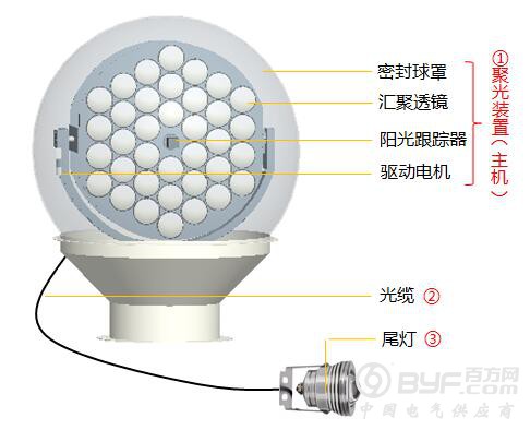 光导光纤日光照明系统主要由聚光装置(主机)+光缆+尾灯组成。