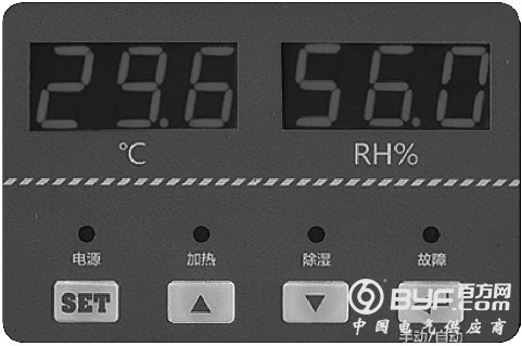 升温型:当F-01设置1时为升温型,当环境温度低于设定温度低值(温度设定值减去温度回差值),加温开始启动,当温度高于高温度值(温度设定值加上温度回差值)加温停止。如同时需冷凝除湿,设置湿度值,当环境湿度高于设定湿度大值(湿度设定值加上湿度回差值)期间除湿装置会全自动开启除湿;当环境湿度低于湿度低值(湿度设定值减去湿度回差值)停止除湿;当手动开启除湿功能时,除湿装置将一直保持除湿功能,直至手动关闭除湿功能。