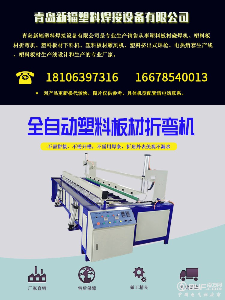 青岛新辐塑料焊接公司专业设计制造全自动PP\PVC塑料板材折弯机直接折弯,不需拼接,不许开槽,不需用焊条,折角外表美观不漏水,将手工焊接转变成全自动的机器操作,提高了质量,提高了劳动效率,降低了劳动利息,大缩短了产品的生产周期。高塑化率,熔体均匀,生产连续稳定,高性能的齿轮箱减速机、扭矩大,寿命长,噪音低。三辊压光机采用水平、垂直或45度倾斜式,可自由升降。控制的辊筒温控系统能精确控制压辊轮温度,使得生产进去的板材光滑,平缓,厚薄均匀。