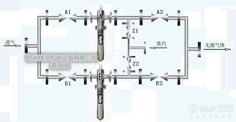 一备一用使用方法A过滤器使用①.打开A1 A2阀门,②.关闭B1 B2 Z1 Z2阀门,使用3天后A过滤器需要蒸汽灭菌时切换至B过滤器使用①.打开B1 B2,②.关闭A1 A2,③.打开Z1(蒸汽阀门) ④20-30分钟后关闭Z1,同样方式切换AB过滤器 交替使用,如有大疫情真空泵超负荷运行可以同时使用A B二台过滤器①.打开A1 A2 B1 B2阀门,②.关闭Z1 Z2阀门联系人;章凤鸣 微信13777578106