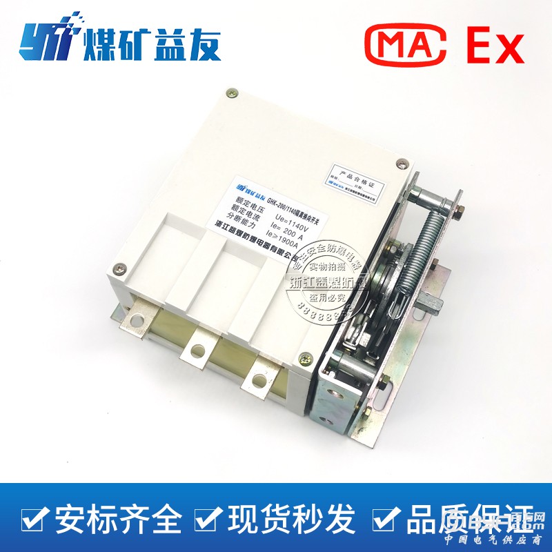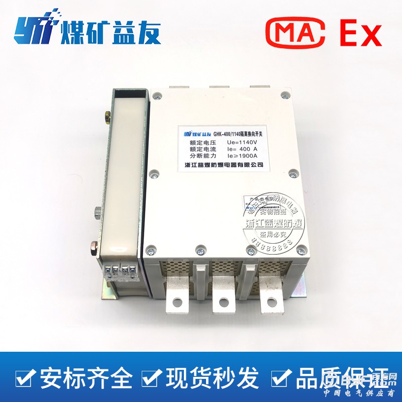 1. GHK-120/1140V;GHK-200/1140V;GHK-400/1140V隔离换向开关,采用双动触头组和正、反向转动触头组构成的双断点式结构,设有消弧栅灭弧系统和用于控制合、分闸的换向操作机构,具有结构简单、分断能力强、可靠性高等优点。