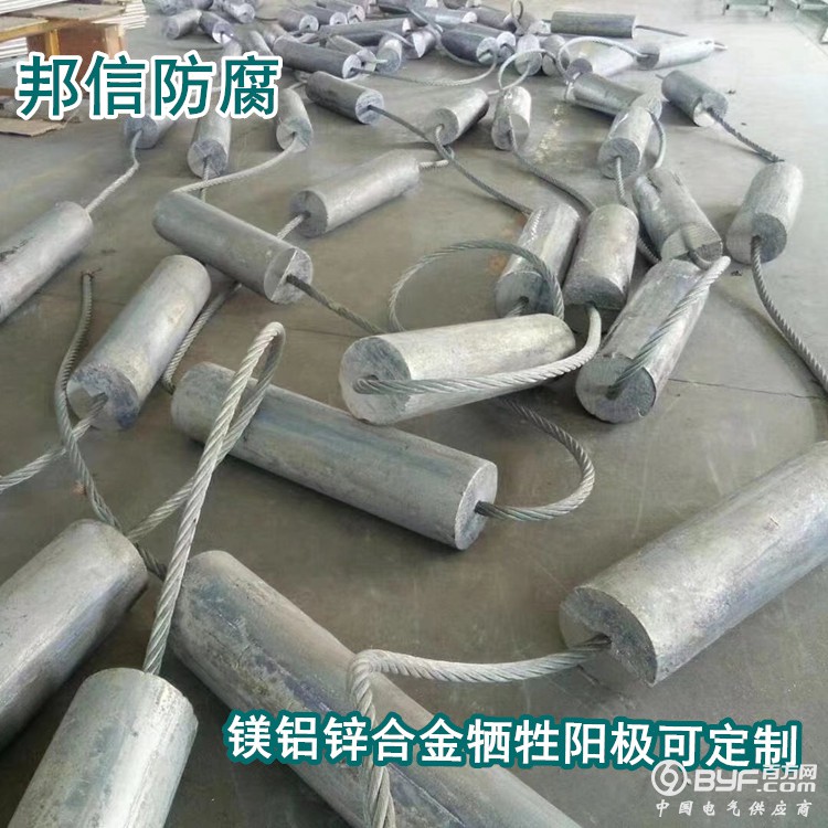 镁阳极有高驱动电压、低电流效率、造价高。根据形状以及电极电位(开路电位)的不同,镁阳极可用于电阻率在15欧姆·米到150欧姆·米的土壤或淡水环境。一般不应用于土壤电阻率小于10欧姆·米环境。高电位镁阳极的电位为-1.75V CSE,驱动电压0.85V;低电位镁阳极的电位为-1.55V CSE,驱动电压0.7V。使用温度可以达到100℃。当牺牲阳极剩余量为***初重量的15%,即认为阳极失效,所以,阳极的使用率一般取85%。牺牲阳极的分布可采用单支或集中成组两种方式,阳极埋设分为立式,水平式两种,埋设方向有轴向和径向。成组埋设时,阳极间距2~3m为宜。